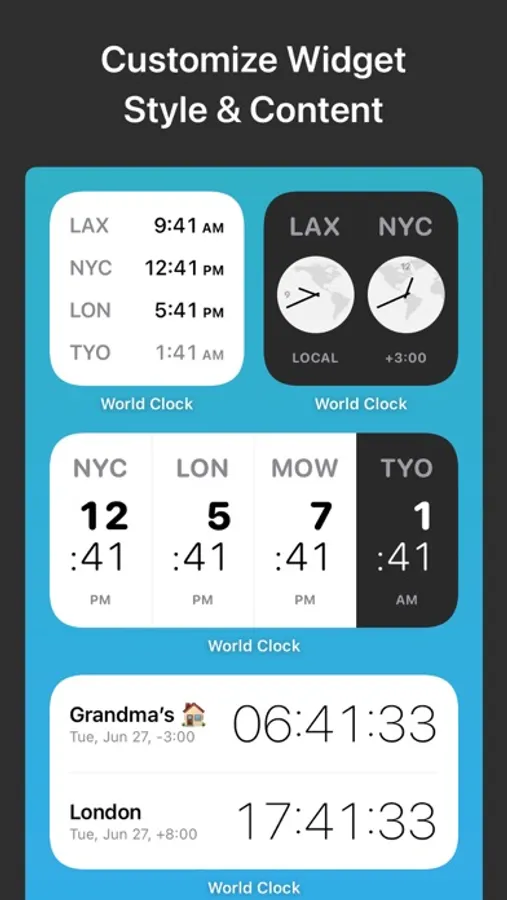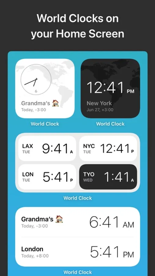 Check the time, anytime! Track the local time in cities across the world, right from your Home or Lock screen. Add cities to World Clock and select the analog or digital clocks. Then check the World Clock widget whenever you need to know the time.