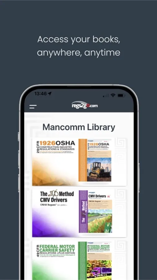 Regs2Go is the digital version of the Mancomm regulations manuals. With Regs2Go you will stay updated on current rules; we use our proprietary trade style– RegLogicTM – to take dense government safety regulations and simplify and organize them for easy understanding.