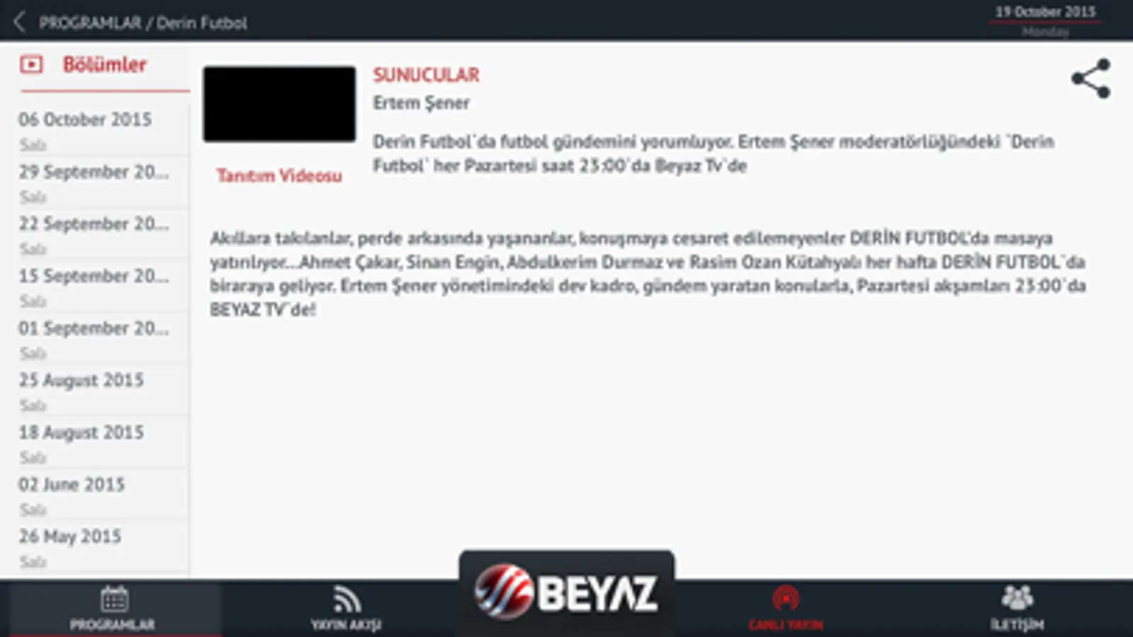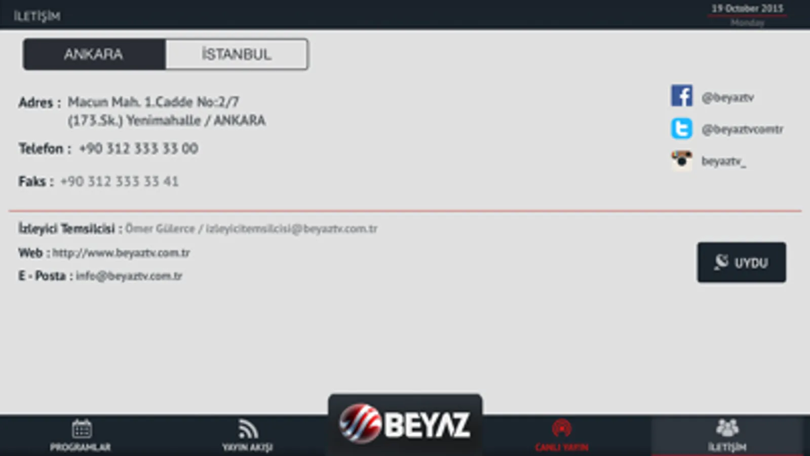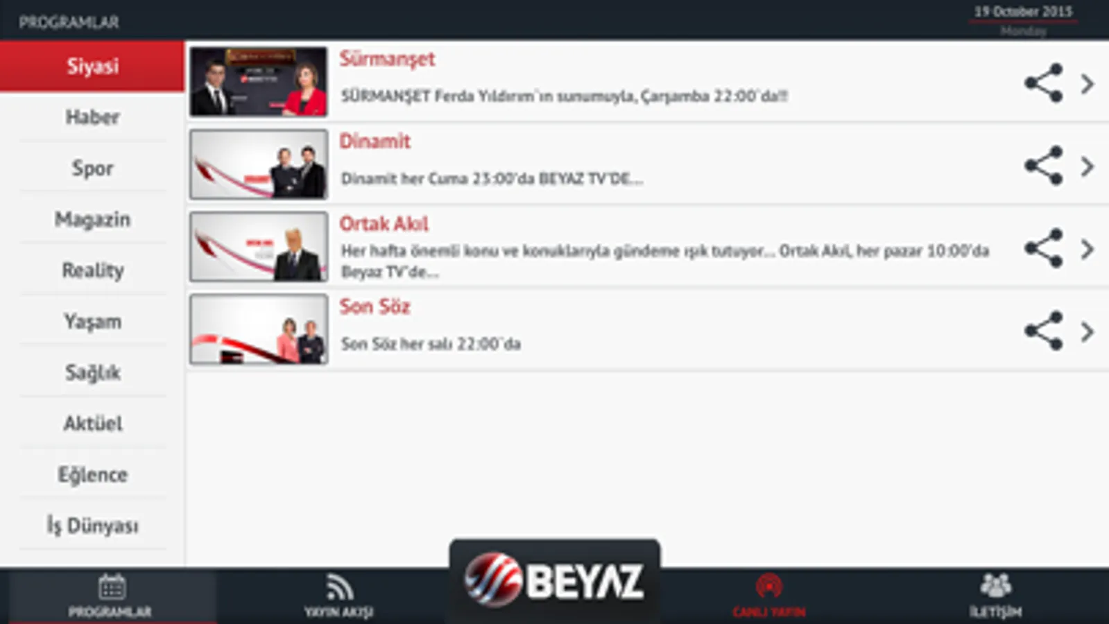 Yeni uygulamamız sayesinde Beyaz TV'yi dilediğiniz her yerde izleyebilir, yayın akışımıza anında ulaşabilir, programlarımız ve programcılarımız hakkında tüm bilgilere anında ulaşabilirsiniz. Yanınızda bulunan mobil cihaz sayesinde istediğiniz an canlı yayın sekmemizi tıklayarak yayındaki programımızı izleyebilirsiniz.