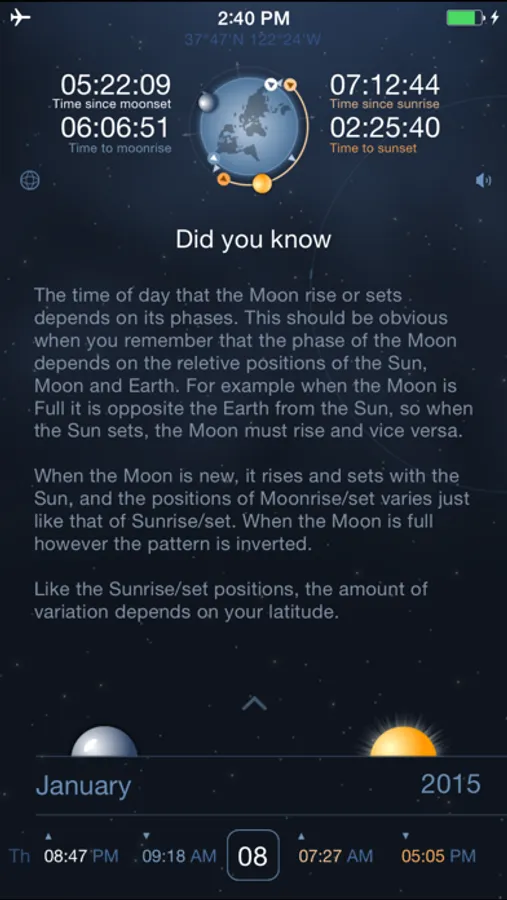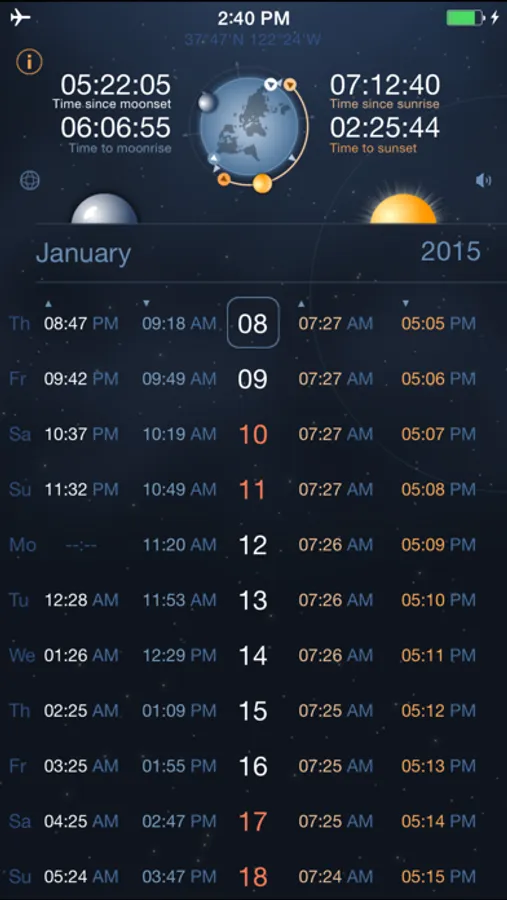 With this app you can get information about raise and set times in any location in the world.