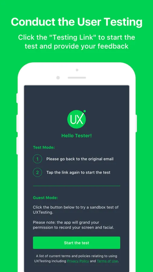 The UXTesting App is an application for testers to conduct user testing and help enterprises make data-driven decisions and dig deeper into user insight with AI and analytics. This app allows you to conduct In-Person Test, Self-Test, or Live mobile user testing while navigating through any website/prototype/app.