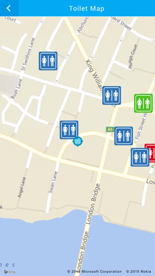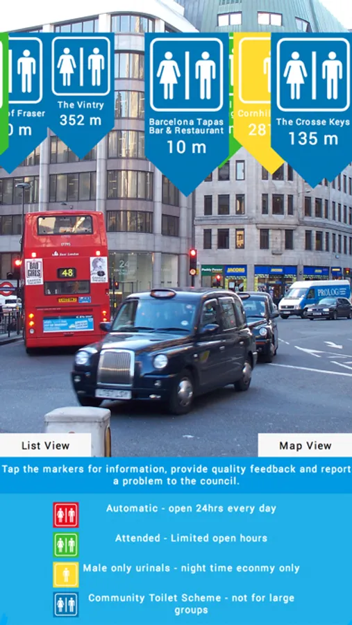 The City of London Community Toilet Scheme has been developed by the City of London Corporation. Selected City of London shops, public houses and cafes allow you to make use of their toilets, free of charge and without making a purchase. Once the City Toilet Finder Augmented Reality App is open, simply look through your devices screen and you will see markers overlaid on the street scene around you, these markers are GPS enabled and identify the distance from each toilet.