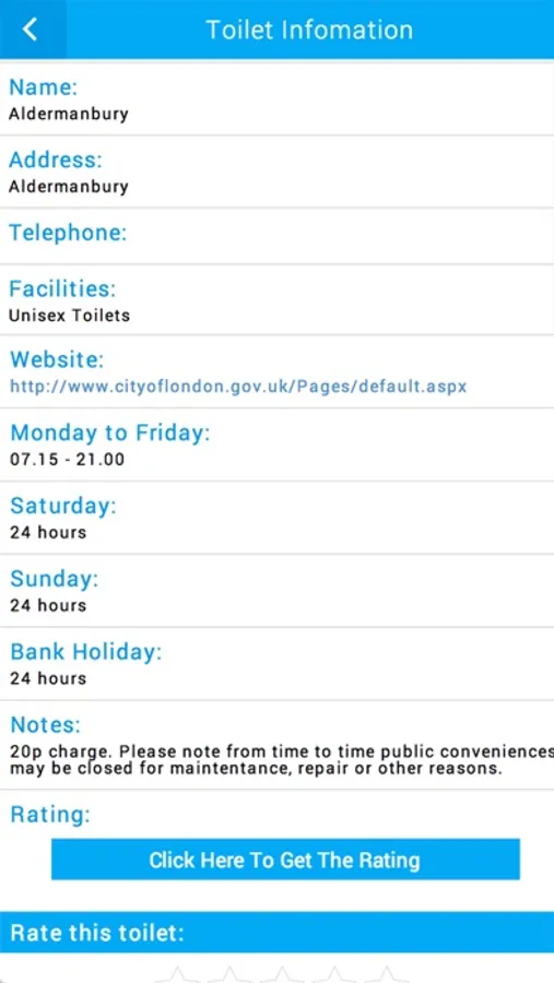To find toilets in the City of London, as you are walking, keep the toilet marker in the center of your screen and the distance will count-down as approach the toilet. You can also ‘view by map’ to see where the toilets are in location to your current position. If required, to help find a toilet in the City of London, the viewer can view address details along with the facilities available for use at each location. A feedback form about the facilities is also included in the App, allowing visitors to pass comments about the toilet back to the City of London Corporation; this includes five star rating system.