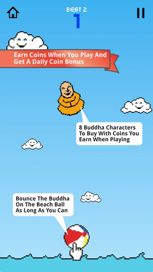Bouncy Buddha is a game of skill and precision. Try and keep the Buddha bouncing on the beach ball as long as you can. Move the beach ball by touching it and sliding it left and right to position it under the Buddha. You earn coins for playing the game and the higher your score the more coins you earn. Once you get enough coins you can buy a new Buddha. Every day you get a daily coin bonus for playing the game.