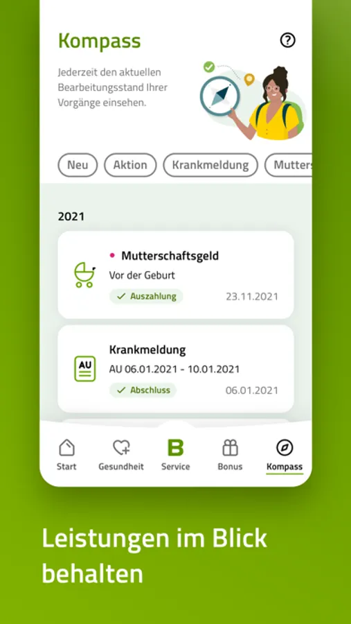 - Kompass: Krankengeldzahlungen, Hilfsmittel, Zahnersatz und Zahnspange, Mutterschaftsgeld und Rehabilitation im Blick behalten