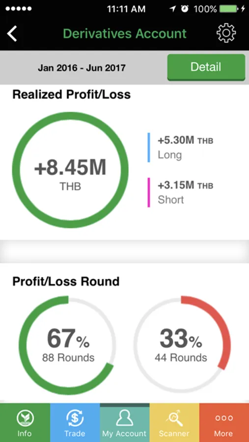 11. My Performance: แสดงข้อมูลและสถิติการซื้อ/ขายหลักทรัพย์และอนุพันธ์ย้อนหลัง เพื่อประเมินและวิเคราะห์การลงทุนที่ผ่านมาได้อย่างมีประสิทธิภาพ ทั้งหุ้นและอนุพันธ์