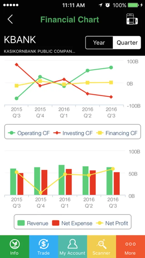 3. Fundamental: ข้อมูลทางพื้นฐานของบริษัทจดทะเบียน สามารถดูงบการเงินรายไตรมาสและรายปีย้อนหลัง 5 ปี และสามารถดู Fund flow แยกตามประเภทนักลงทุน