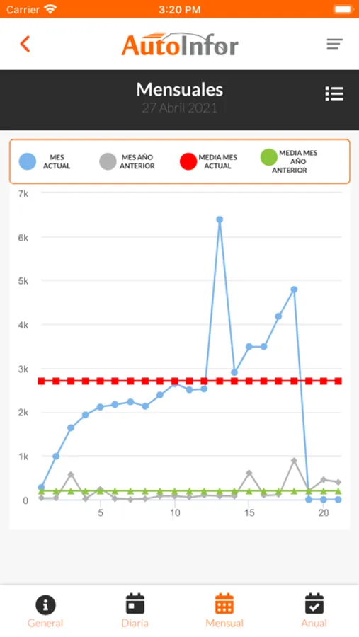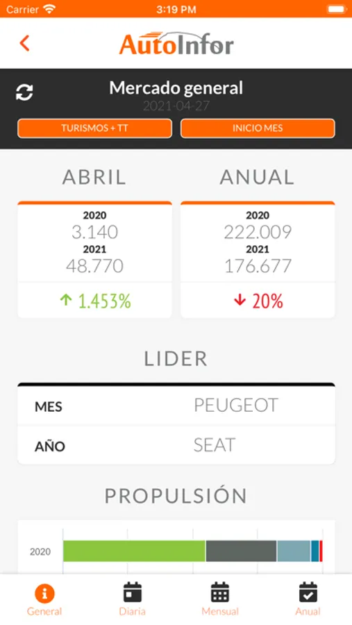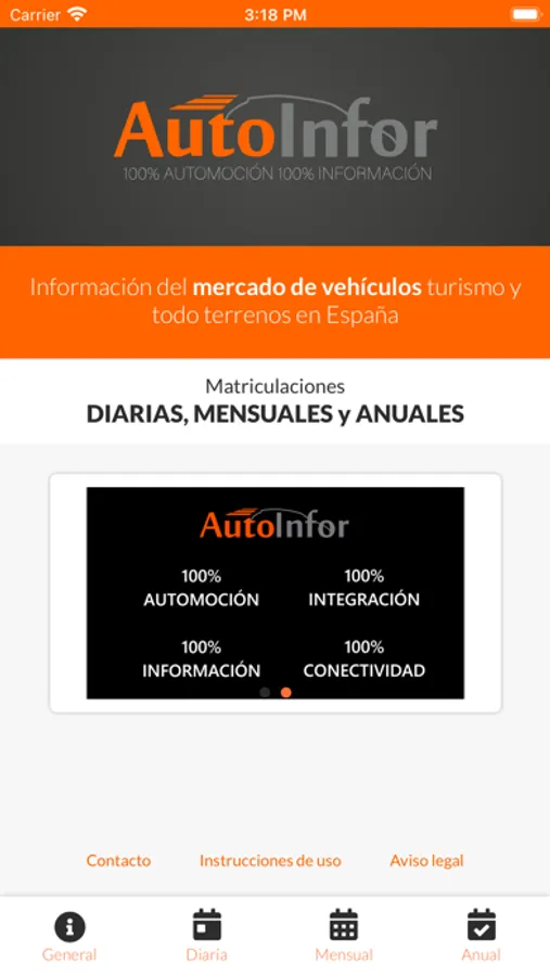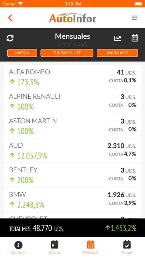 AutoInfor proporciona datos actualizados a diario de matriculaciones en España segmentados por marcas y provincias.- Muestra los líderes del mercado, con datos actualizados cada día.- Ofrece la posibilidad de ver los datos de un día, de un mes o de un año.- Permite comparar datos de matriculaciones respecto al año anterior.- Incluye los datos de los turismos y de los todo terreno.- También posibilita comparar los datos en función del número de días que han pasado y en función del número de días que quedan para acabar un mes.