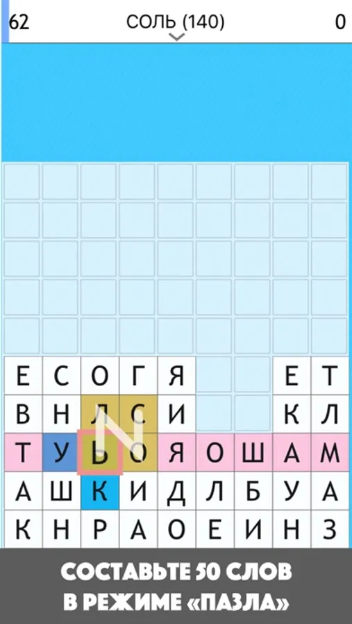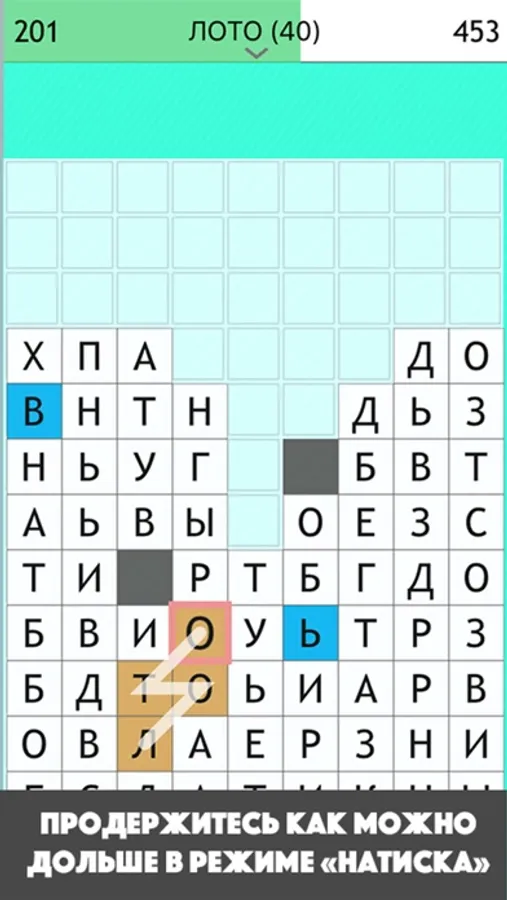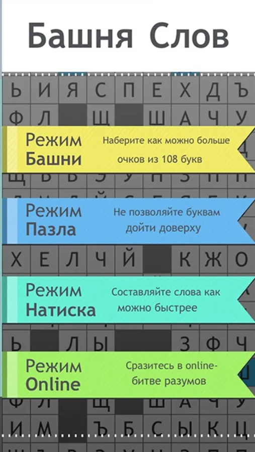В "Режиме Пазла", "Режиме Натиска" и "Режиме Online" не позволяйте буквам достигнуть верхнего края поля!