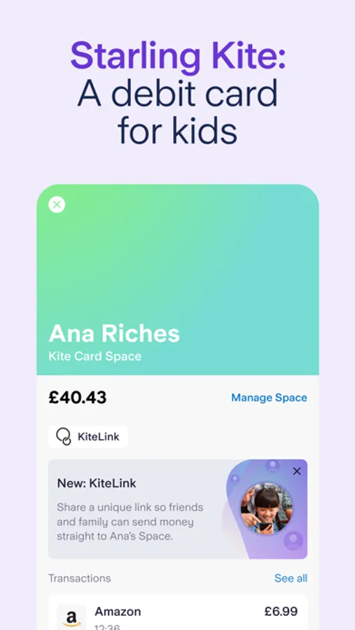 Kite is our debit card and app for kids. It’s like a child bank account, but built seamlessly into your Starling account (personal or joint) for better visibility and control. Kids have their own version of the app, too.