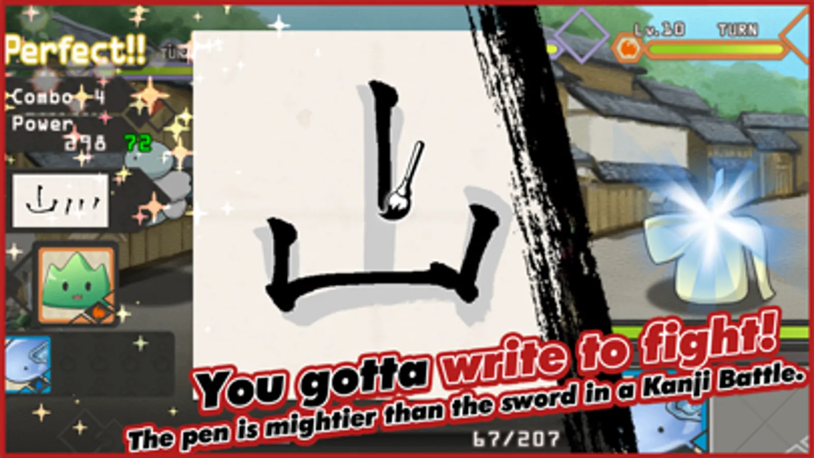 Write to help your Kanji Party fight. As you write the character on the screen, the corresponding Kanji battle power will increase.