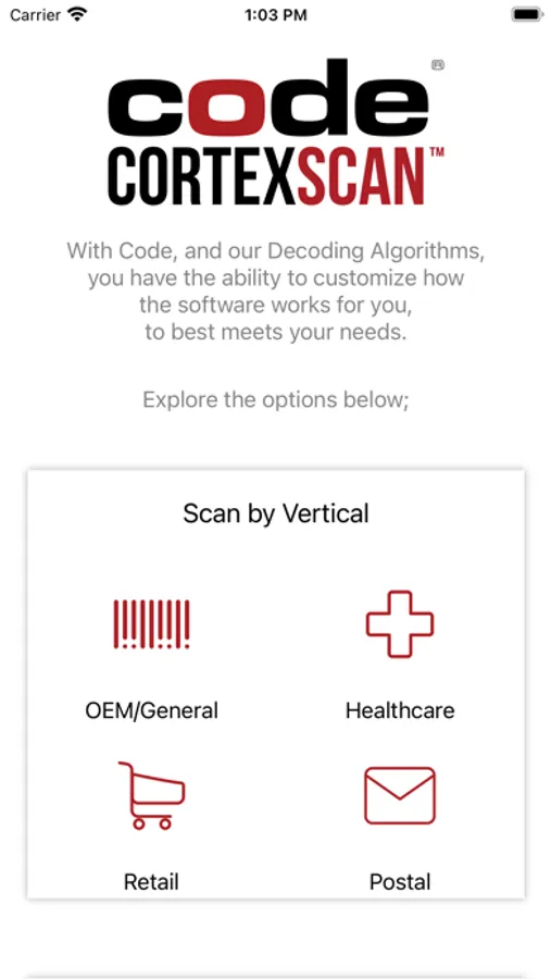 The CortexScan app is a barcode reading application powered by Code's CortexDecoder. CortexDecoder is an enterprise-grade barcode decoder capable of using the built-in camera on your device to read and decode over 40+ barcode symbologies using proprietary decoding algorithms. The power of CortexDecoder is available for virtually all platforms, including embedded systems and Code's own hardware scanners.