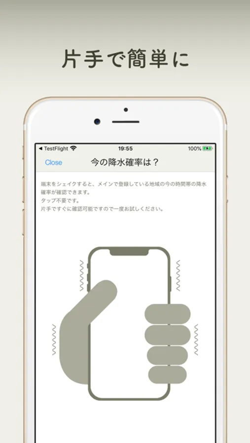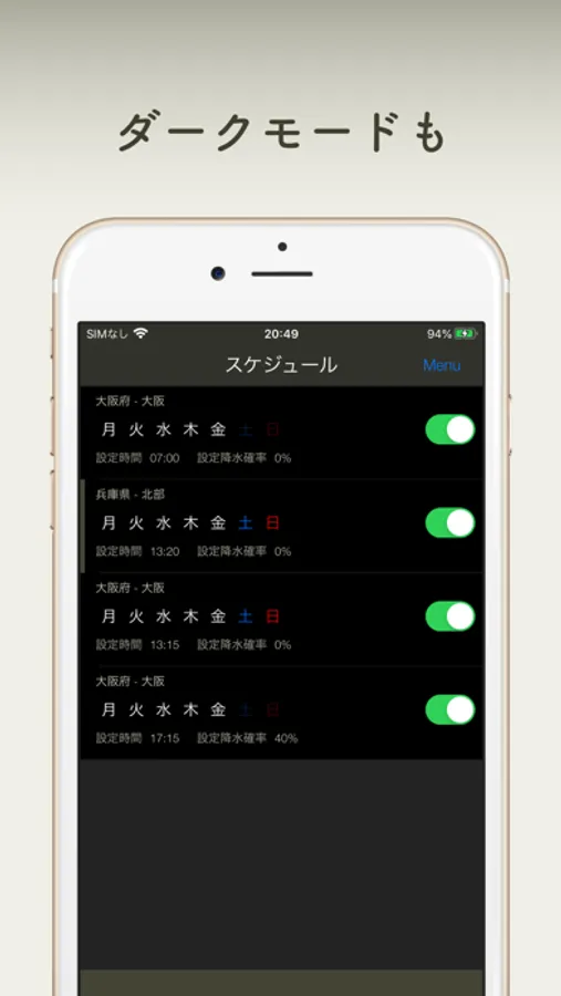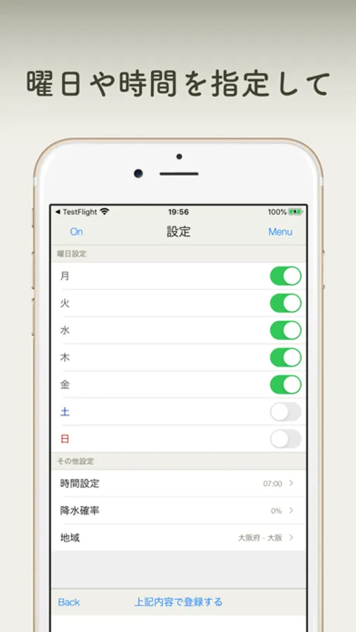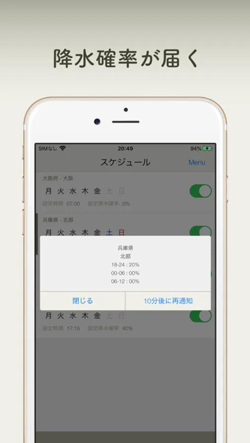 毎朝設定した時間に降水確率だけをプッシュ通知でお送りいたします。