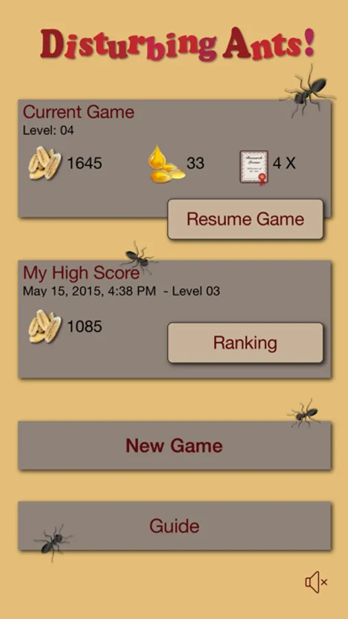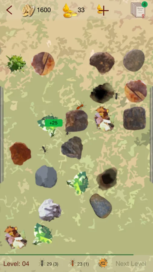 You are a scientist who explores ant behavior. You need to find as many ants as you can. For every ant you find you get points which are called "Grains". However, you may only disturb an ant once. After an ants is disturbed it turns red and if you distrub a red ant again it costs you. So, find the ants by removing or touching their hiding places. Ants will hide under other hiding places after you distrubed them. When ants hide again they turn red. You do not want to disturb them again, so watch where they go. And if you kill ants you get additional penalty. With every next level there will be more ants and they will move faster.