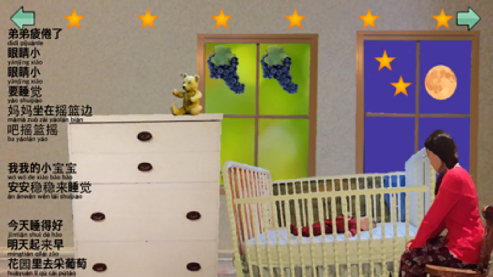 This app is for kids to learn Chinese nursery rhymes and lullabies. Even babies as young as 8 months old will get a kick out of hearing the songs and interacting with the scenes in the app!