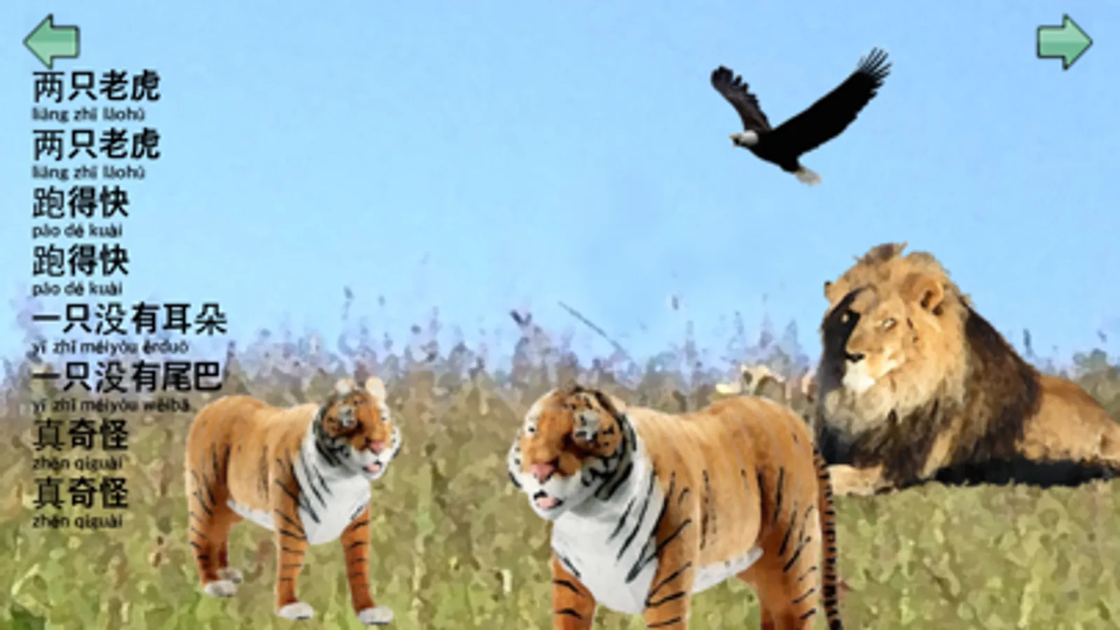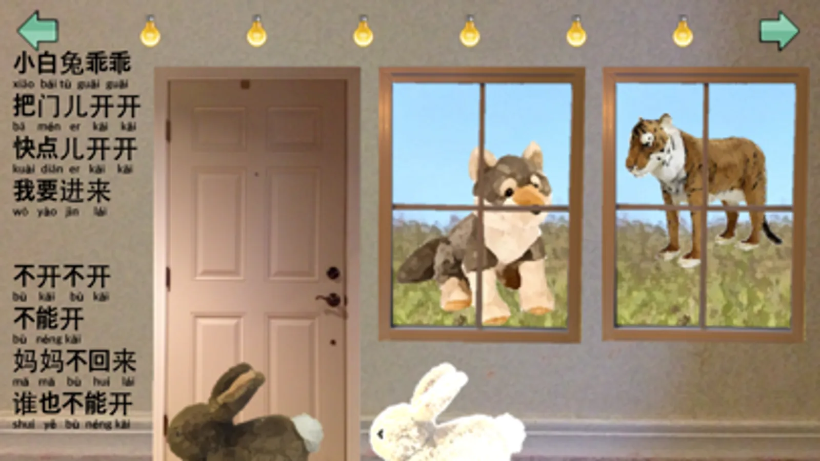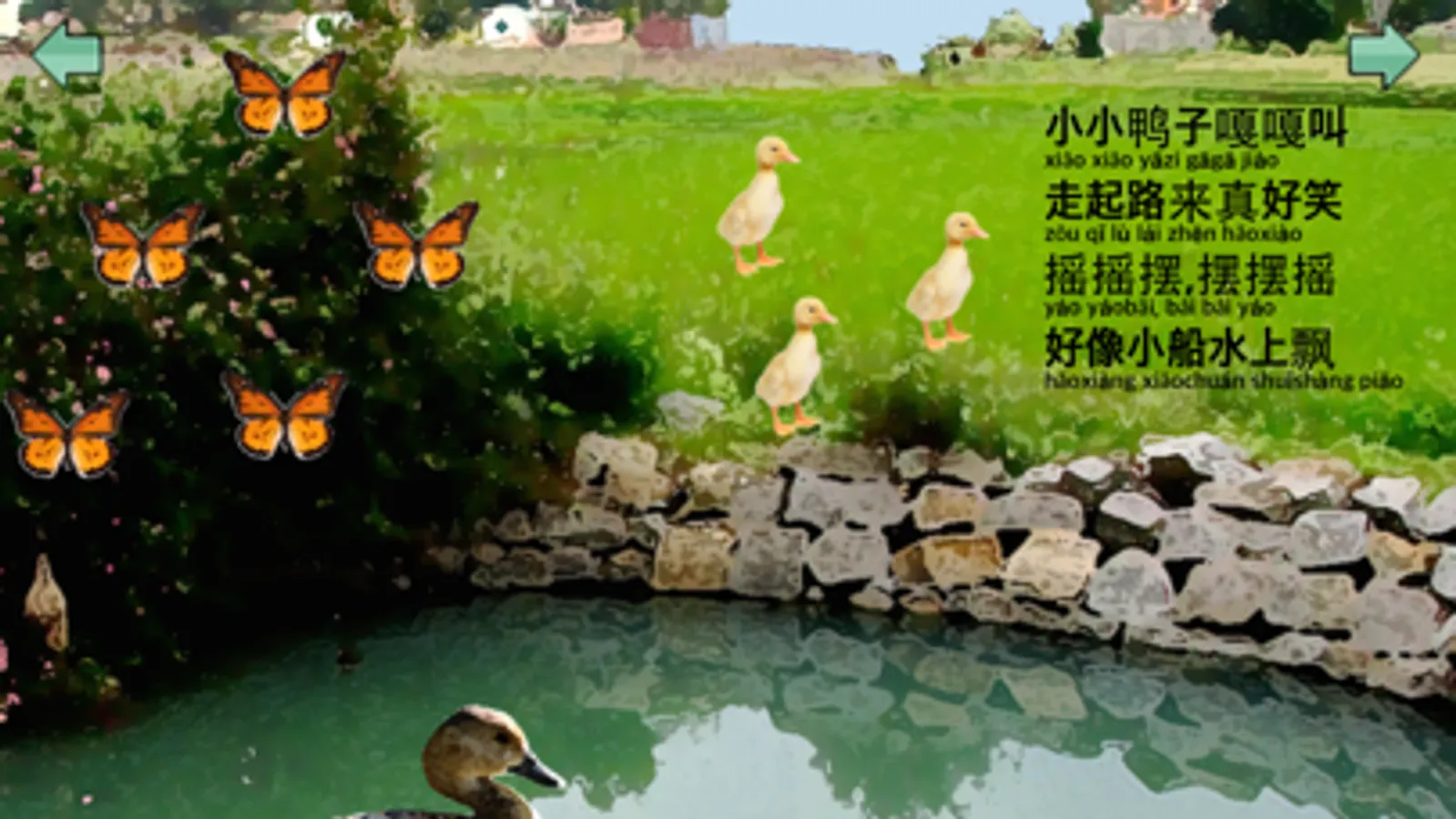 Each song is sung in Mandarin Chinese, in a nice mezzo-soprano voice. The lyrics appear in Chinese with pinyin, and translations appear when objects are tapped. In addition, the objects in each scene are interactive!
