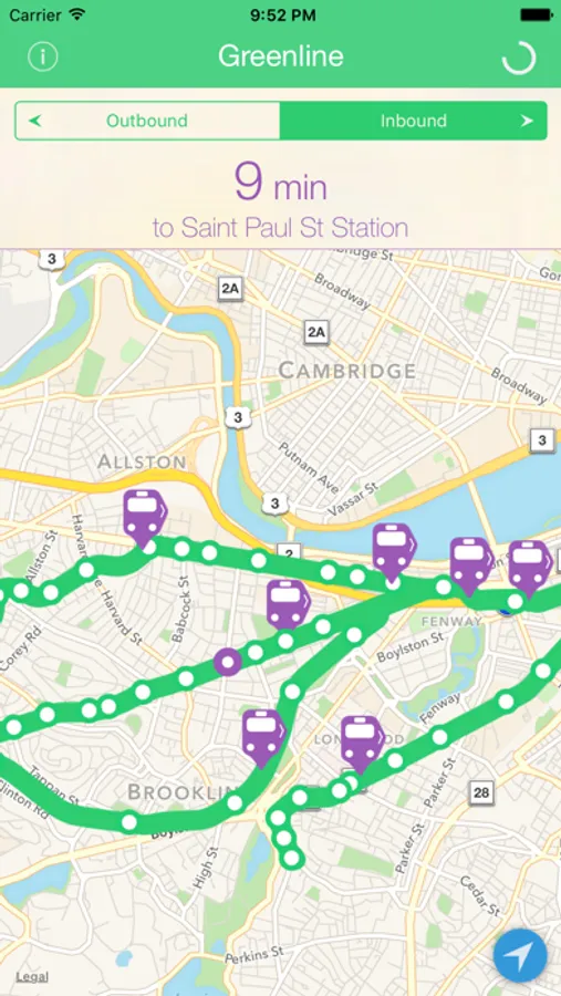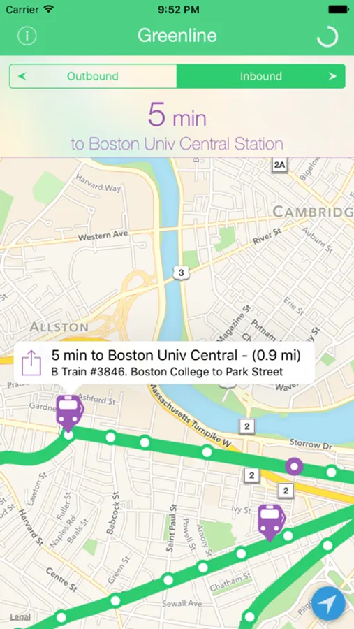 Greenline displays the real-time arrival predictions and locations for all MBTA Green Line trains.