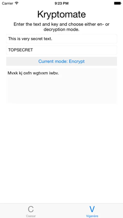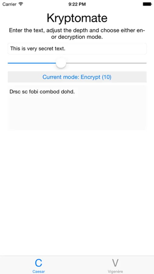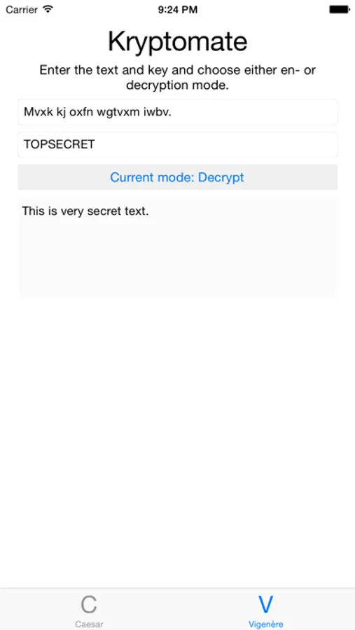 Kryptomate is an app to help you en- or decode small text snippets through either Caesar or Vigenère cipher. Be it for a puzzle (e.g. for a Geocache) or for fun with your friends.
