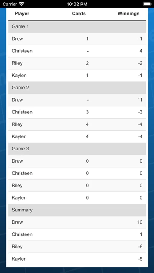 The PokerPool Scorecard keeps track of all the scores. You add the players, configure the stakes and the app will take care of the rest. As the game is played, simply enter the number of cards remaining and PokerPool Scorecard will keep a running total of each players progress. At any point players can view their running in-game totals or hit the scorecard button (in options) to review the entire game play.