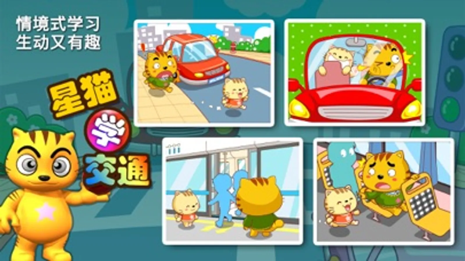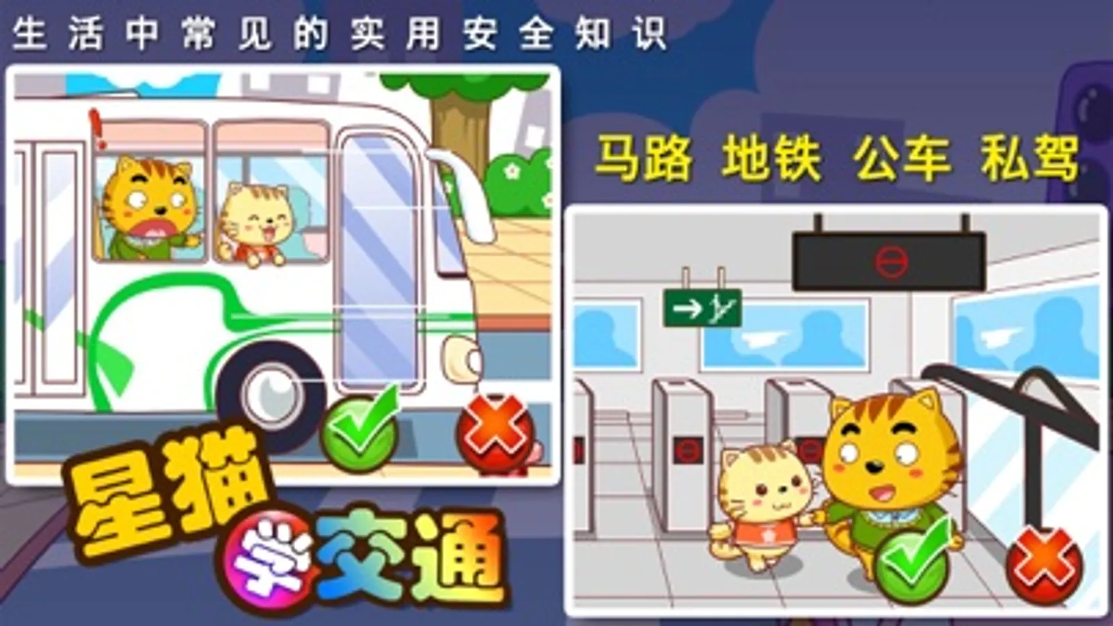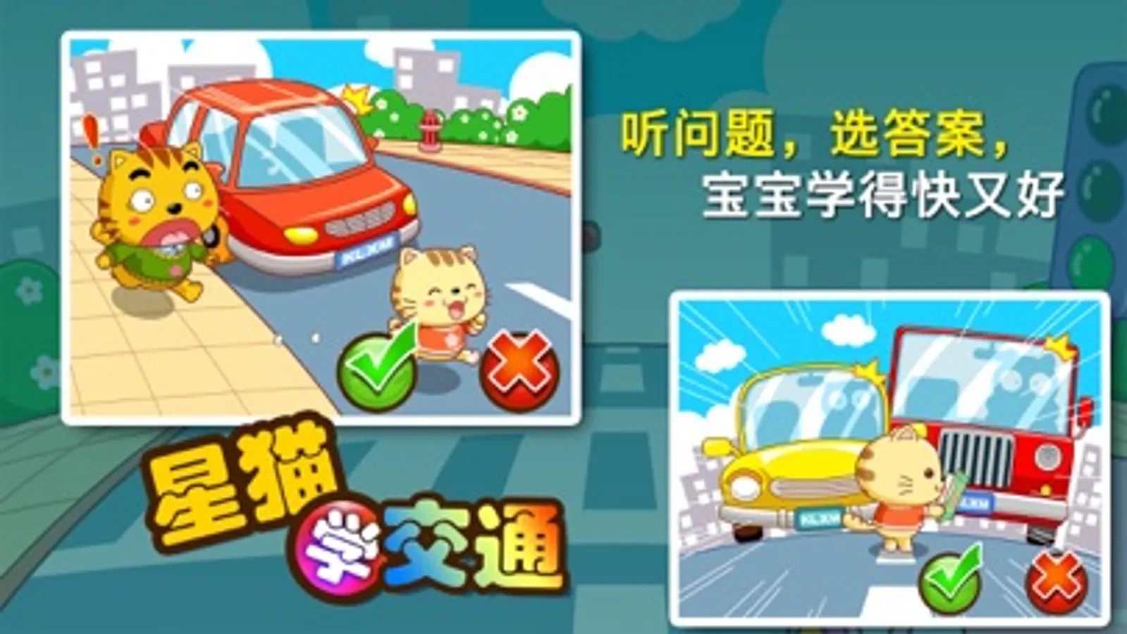 《学交通_星猫小课堂》以星猫带Baby猫乘坐各种交通工具为主线场景,教会小朋友们如何安全的乘坐交通工具。同时,还提供了一个强化交通安全知识的问答题模块,以及一个有趣的卡通动物园。