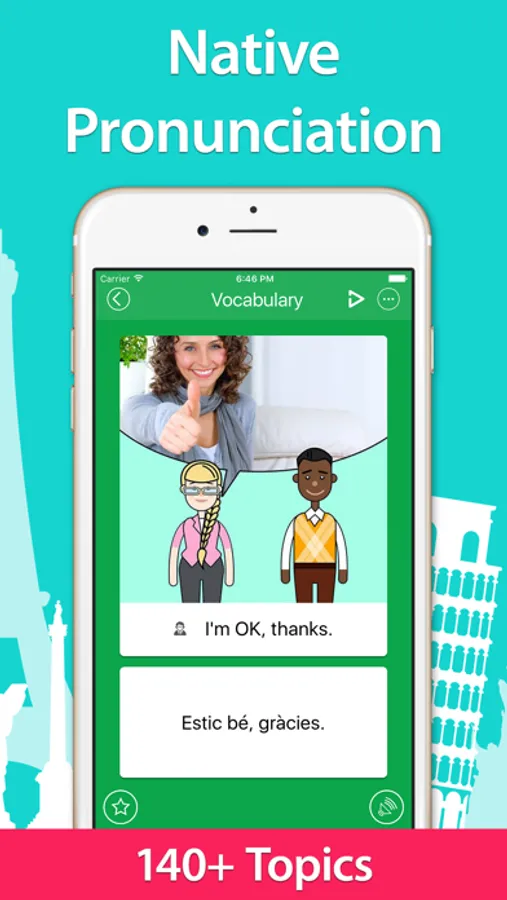 - 5,000 Catalan phrases –– an enormous library with accurate phonetic transcriptions and clear pronunciation recordings for learning how to speak and sound like a native speaker.