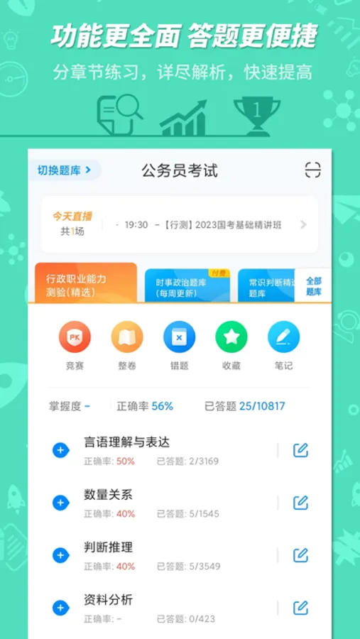 101贝考公务员考试拥有数万道由公务员考试培训专家精选的各类题目,覆盖行政能力测试(行测)、申论、面试、公共基础(公基)、职业能力测试(职测)、综合应用能力等考试的所有知识点。另有三支一扶(农村知识)、公安招警、每月时政、农信社招聘等专项题库。无论是国考、省考、市考、事业单位考试,还是三支一扶、农信社招聘等专项考试,只要您拥有一部iphone,依托101贝考平台的公考移动课堂学习体系,您就能合理利用碎片化时间,随时随地备考!每天使用半小时,轻松实现公职梦想。