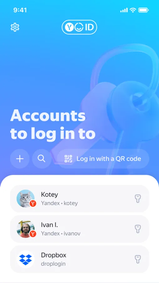 Yandex Key safeguards your account from being hacked and your personal information from being stolen. One-time passwords will be available only to you, on your mobile device.