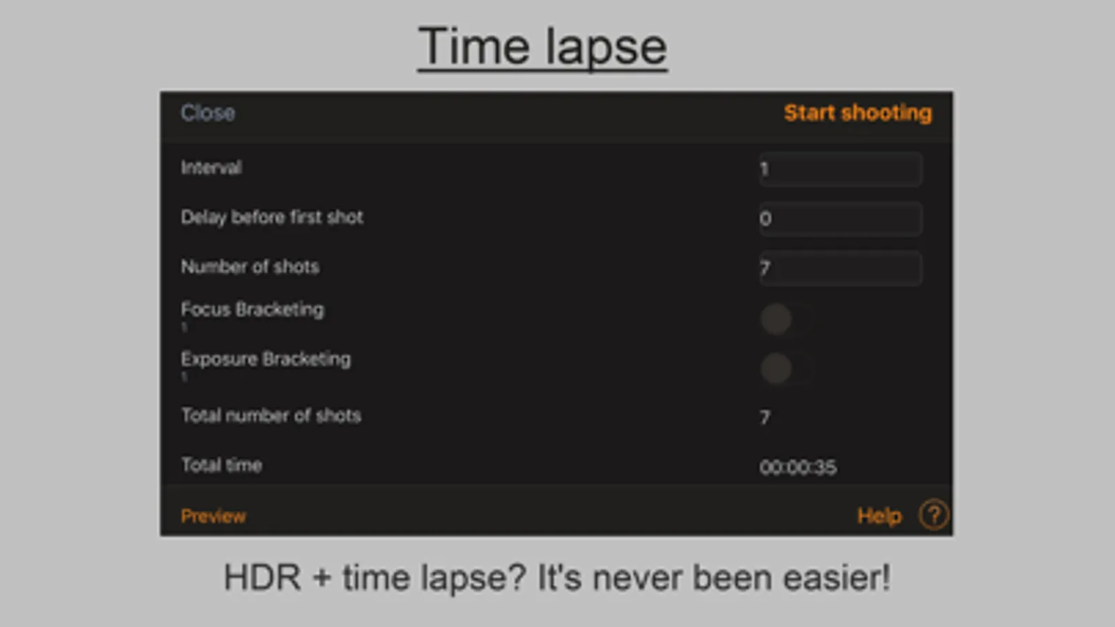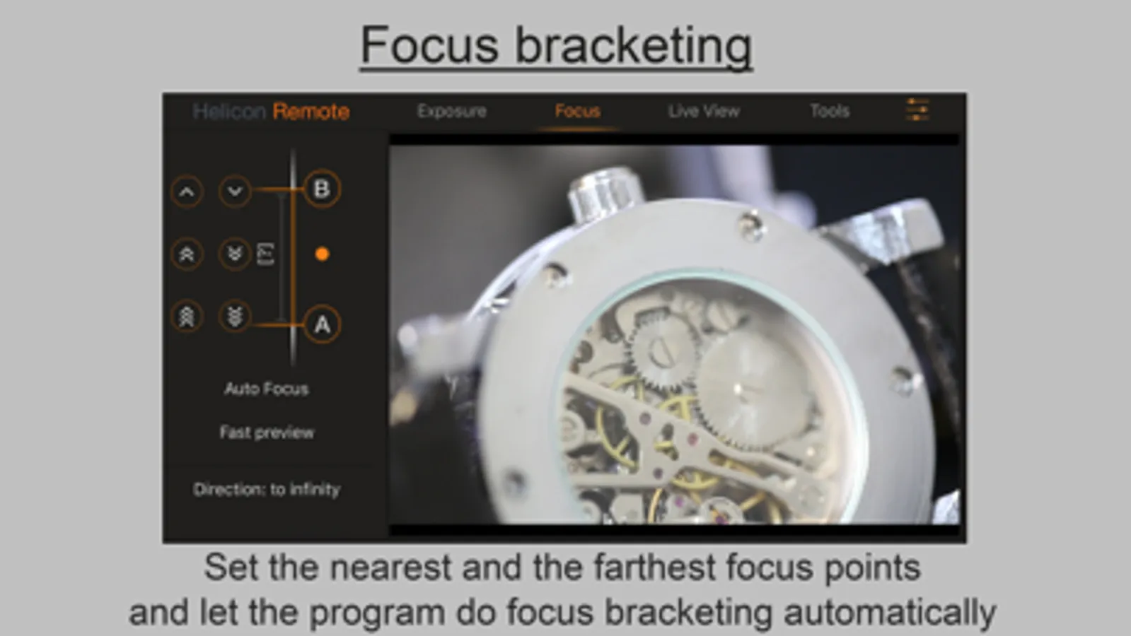 - Automated focus bracketing (focus bracketing, exposure bracketing and time lapse shooting can be combined in any way possible)