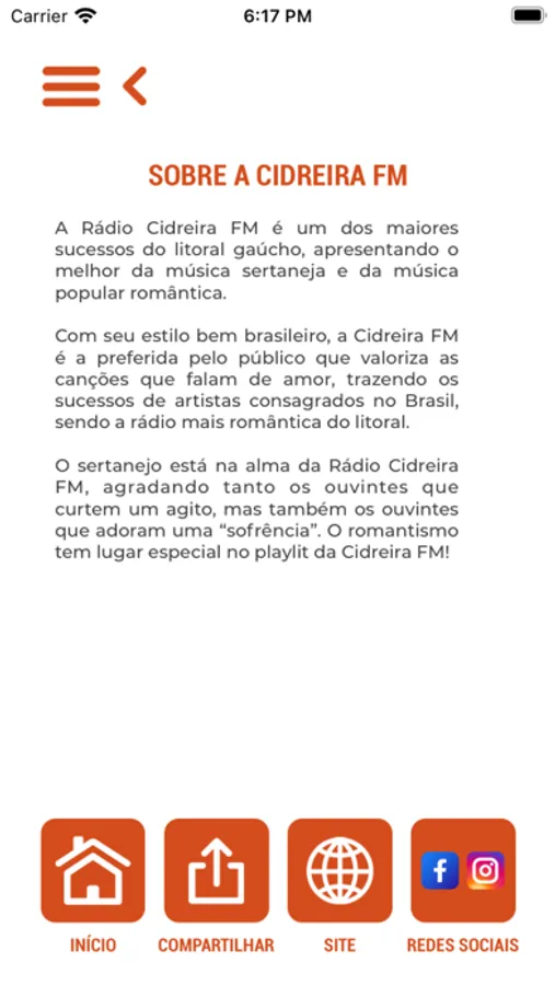 Aplicativo da Rádio Cidreira FM, uma emissora da Rede Pampa de Comunicação.