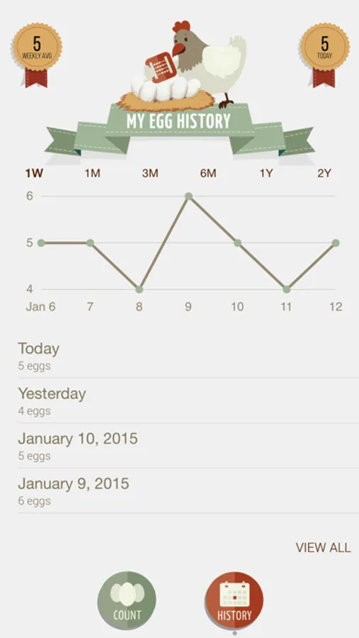 Count Your Eggs helps backyard chicken owners track their egg production. Simply enter your egg count each day when you gather eggs. The app graphs your production over time so you can spot changes in laying trends and make better predictions.