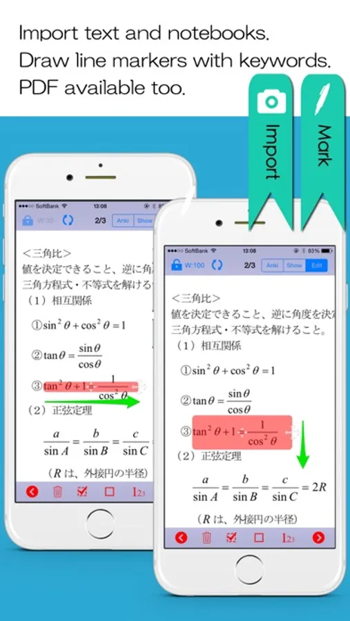 Importing your text or notebook by camera or pdf files, and drawing line markers with keywords. And you'll get original study environment.