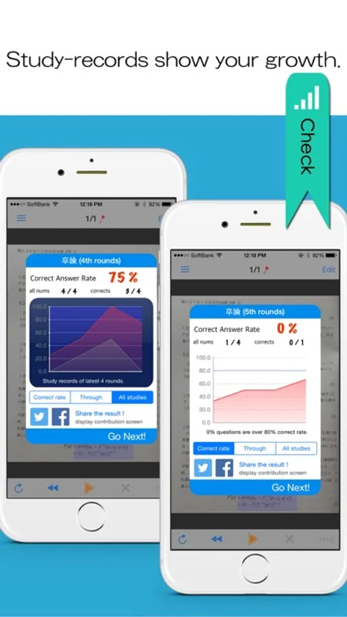 Three kinds of graphs help you feeling steady growth. Development of correct answer rates of all studies and of through-studies. (Through-study means study without filtering to remove questions.) The last one is correct rate distributions of all questions.