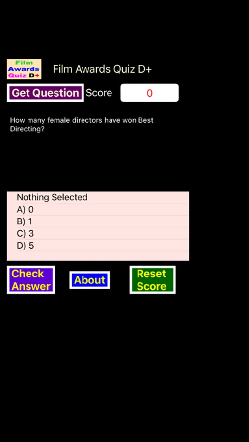 You gain two points for each correct answer, and lose one point for each incorrect answer. There is no penalty for skipping a question. Just tap Get Question again to display a different question. Since the questions cover the Oscar nominees from 1929 through the present day, they can be fun and challenging as they may cover recent nominees or ones from decades ago.