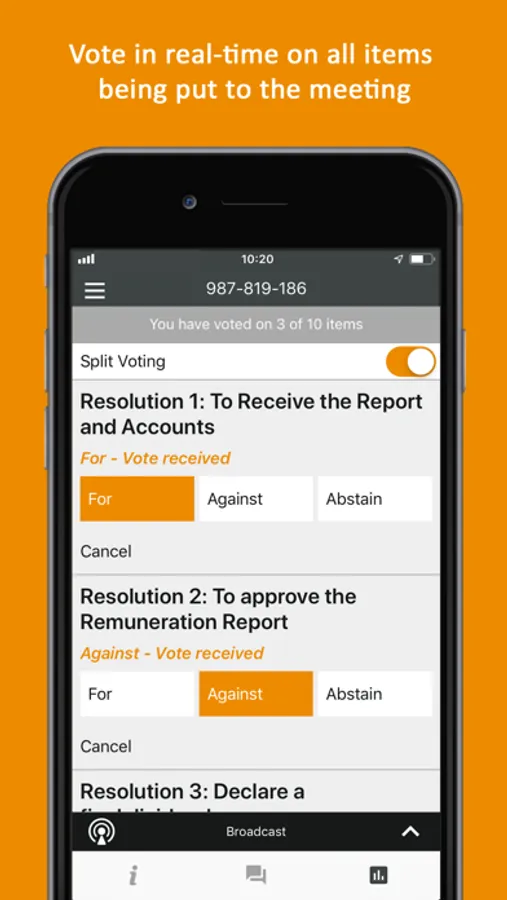 Authenticate yourself by logging in to the app with your credentials supplied by the meeting organisers. If you’re voting in real time, or at your own pace, Lumi AGM ensures all proxy votes and instructions received before the meeting are taken into account before calculating an accurate, fully auditable result.