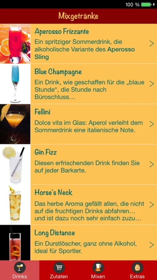 Hier werden die Rezepte (Zutaten und Zubereitungsschritte) einiger der beliebtesten Longdrinks und Cocktails in App-Form geboten. Geeignet für jeden, der ein paar Drinks mixen und nicht gleich eine teure App, Rezeptbücher oder Barausstattung anschaffen möchte.