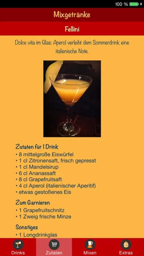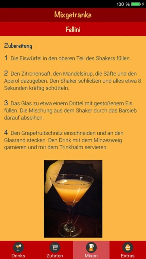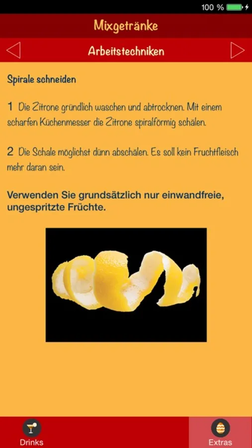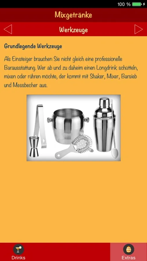 Eine kurze Beschreibung häufig verwendeter Techniken und Bar-Utensilien ergänzt den Inhalt dieser App.