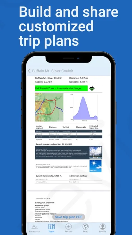 • Build and share customized trip plans highlighting terrain and weather data, travel times and avalanche safety checklists.