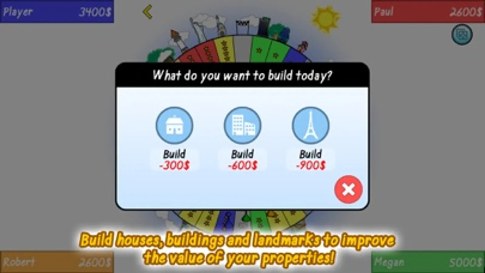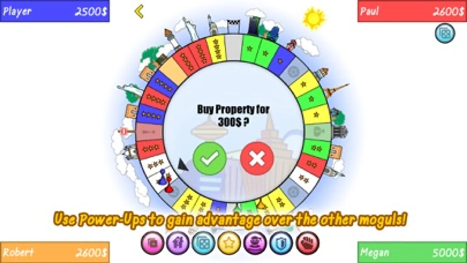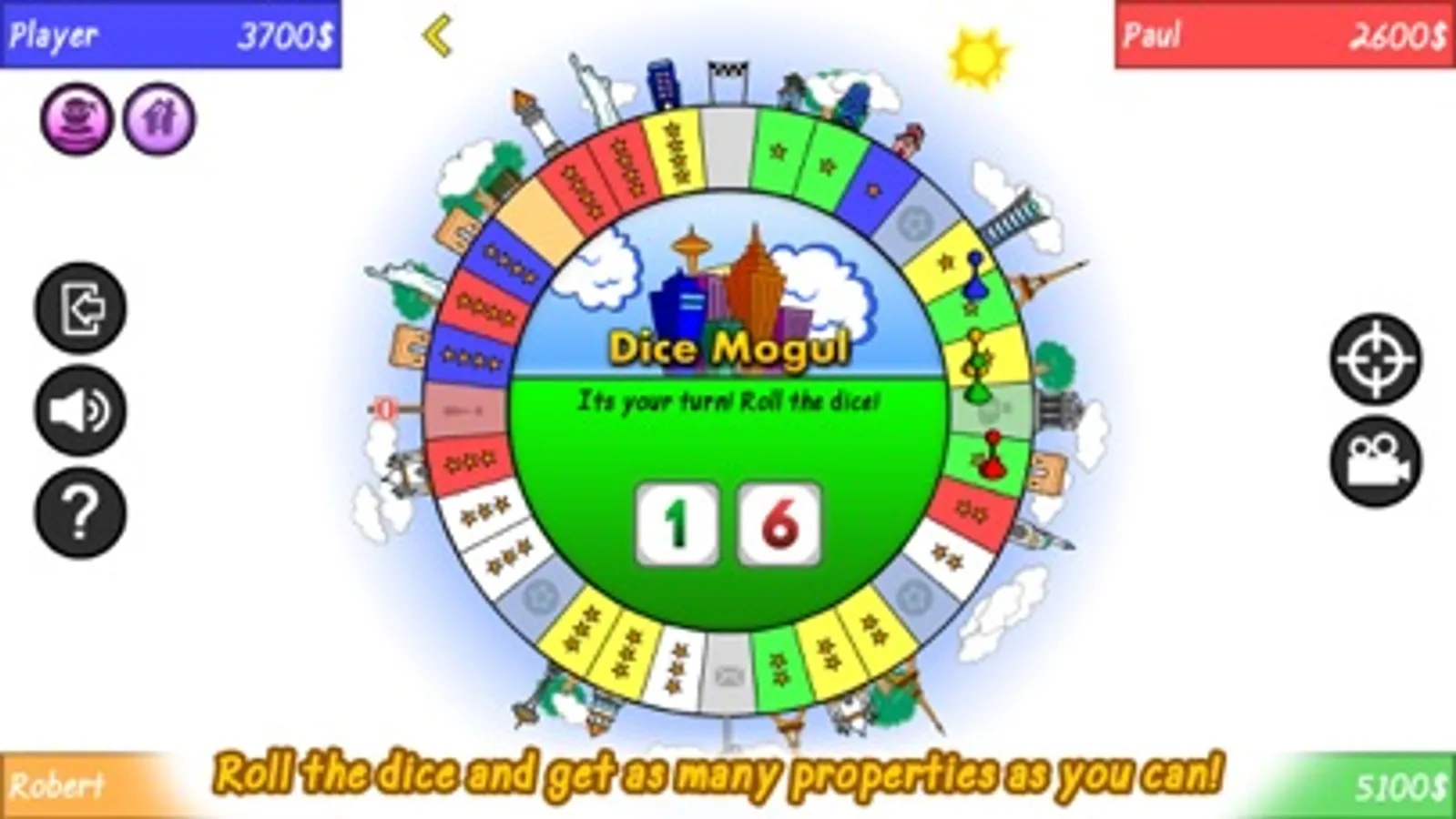 You play as a mogul that wants to establish a monopoly and get the city for himself. Roll the dice and get as many tiles as you can! Build houses, buildings and landmarks to increase the value of your properties.