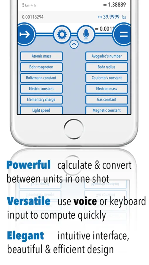 Use your voice or the custom keyboard to input calculations and unit conversions easily and quickly. Mix units, parentheses, math functions in a single computation. Tap into a catalogue of physical constants quickly. For both casual and scientific use, from the kitchen to the lab.