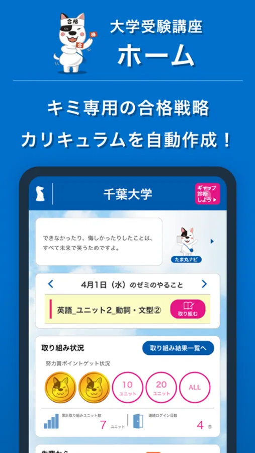 ・【受験生向け】志望大・受験科目にあわせておすすめの取り組みユニットが日ごとに表示されます。