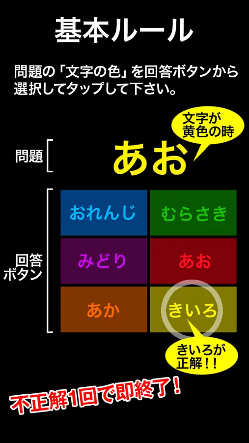 出題される『文字の色』を回答ボタンの『文字』で答えてください。