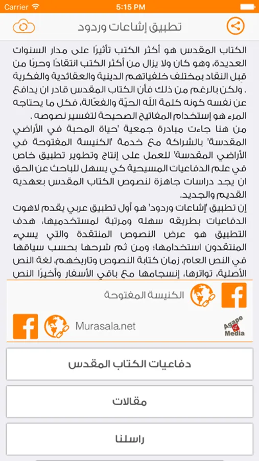 كما ويعرض التطبيق إمكانية التواصل معنا من خلال العناوين المعروضة في التطبيق، وان كانت لديك أسئلة او استفسارات بخصوص نصوص معينه او اي سؤال او ملاحظة تتعلق بالعقيدة المسيحية يمكنك مراسلتنا ايضا.