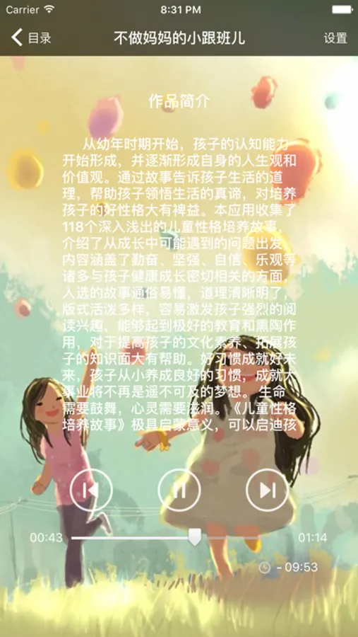有声儿童性格培养故事简短、生动,引导宝宝的个性发展,简短、生动的故事充满了爱心和智慧,是宝宝心智健康发育成长的最好的启蒙老师,能让宝宝从中懂得深刻的道理,更能引导宝宝的个性发展,培养善良、自信、坚强、勇敢等优秀品质。