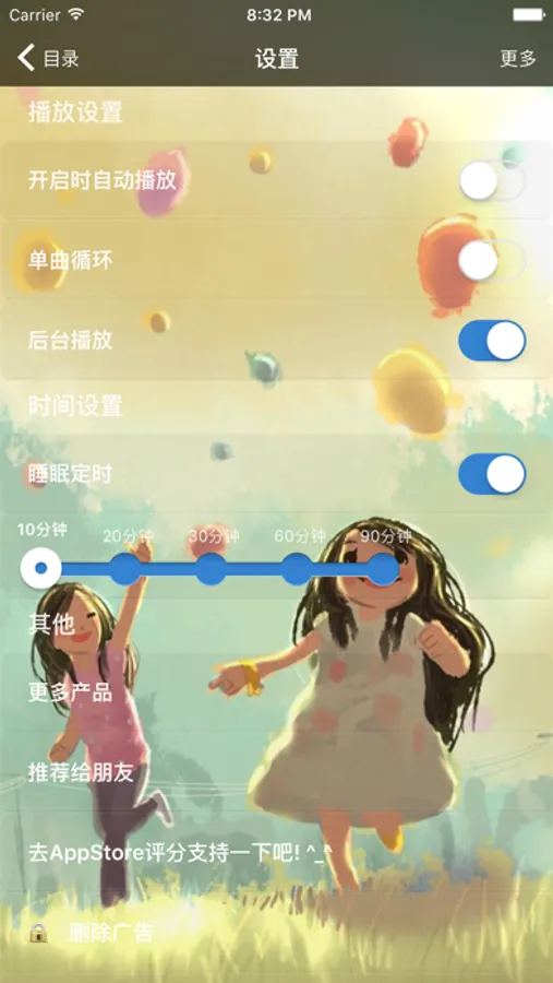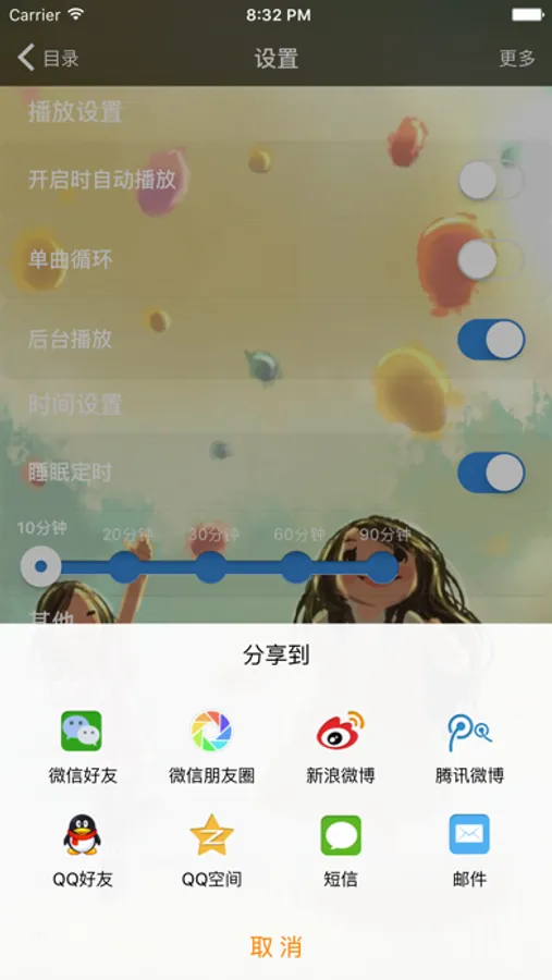 4.睡眠定时:设定自动关闭播放时间,时长从5分钟到3小时,到时自动关闭播放。