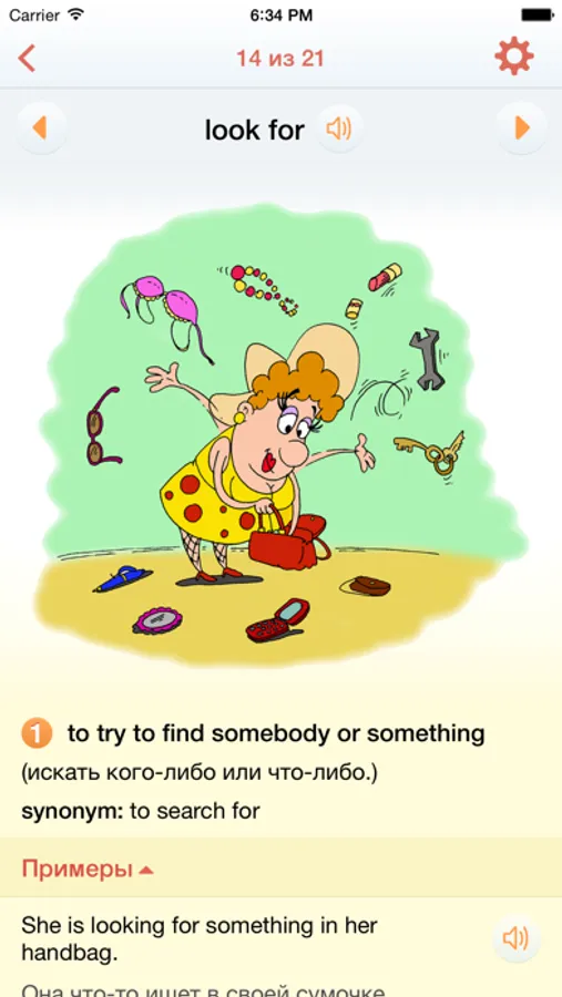 Вам даются предложения на русском языке и вам нужно перевести их устно, в уме, на английский, используя те фразовые глаголы, которые изучались в данном юните. Затем, нажав надпись «посмотреть перевод», вы откроете английский вариант этого предложения, он так же озвучен и его можно послушать, нажав на кнопку «динамик». Затем можно перейти к следующему предложению, нажимая кнопку «вперед» или перелистывая пальцем.