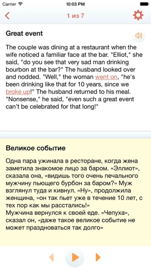 Дается так же параллельный русский текст, чтобы вы могли сверяться и тренироваться в переводе.
