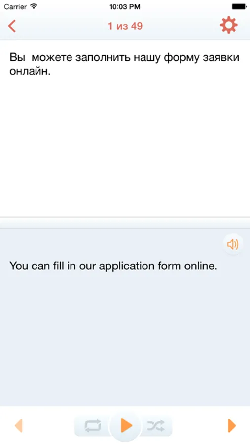 Рядом с кнопкой «плэй» есть две кнопки знакомые вам по любому плееру. Это «перемешать» и «пустить по кругу». Первая, соответственно, выдает вам эти фразы в случайном порядке, чтобы вы не привыкали к определенной последовательности. Вторая позволяет слушать и тренироваться так долго, как вам нужно. Нажав обе сразу, вы получите идеальный тренажер, который можно запускать в любом месте, и в любое время. За рулем, в метро или занимаясь чем-то еще.