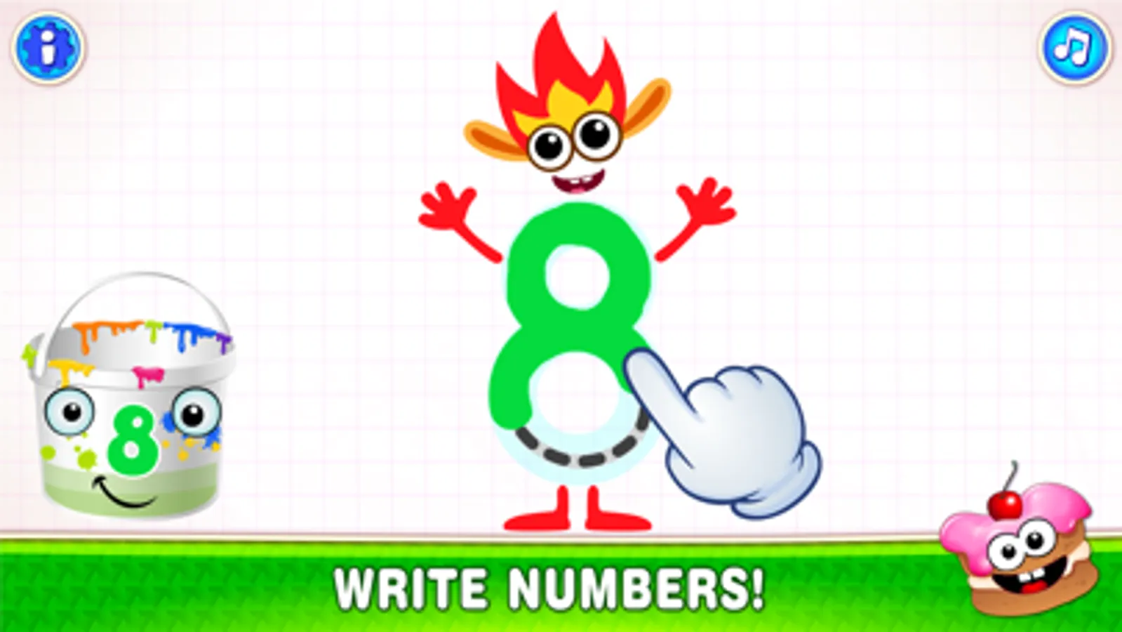 While playing with little number-characters your child will learn numbers and how to write them. They will master counting and learn the correlation between numbers and quantities.