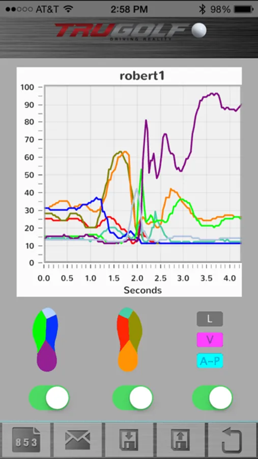 With TruBalance V, we’ve added high-speed video capture that is synced with the insole data to allow evaluation of your CORE balance position at various points in the golf swing or during a putt. The app allows you to save and share your CORE balance data and videos of your swings between users via email.