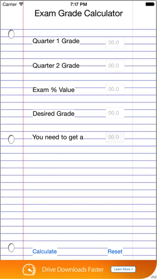 Exam Grade Calculator is the perfect tool to determine what you need to get on an exam or final to receive a certain grade in a class. Just fill in the numbers and tap calculate to determine what you need to get on the exam, no math required. It even accounts for different weighted exams.